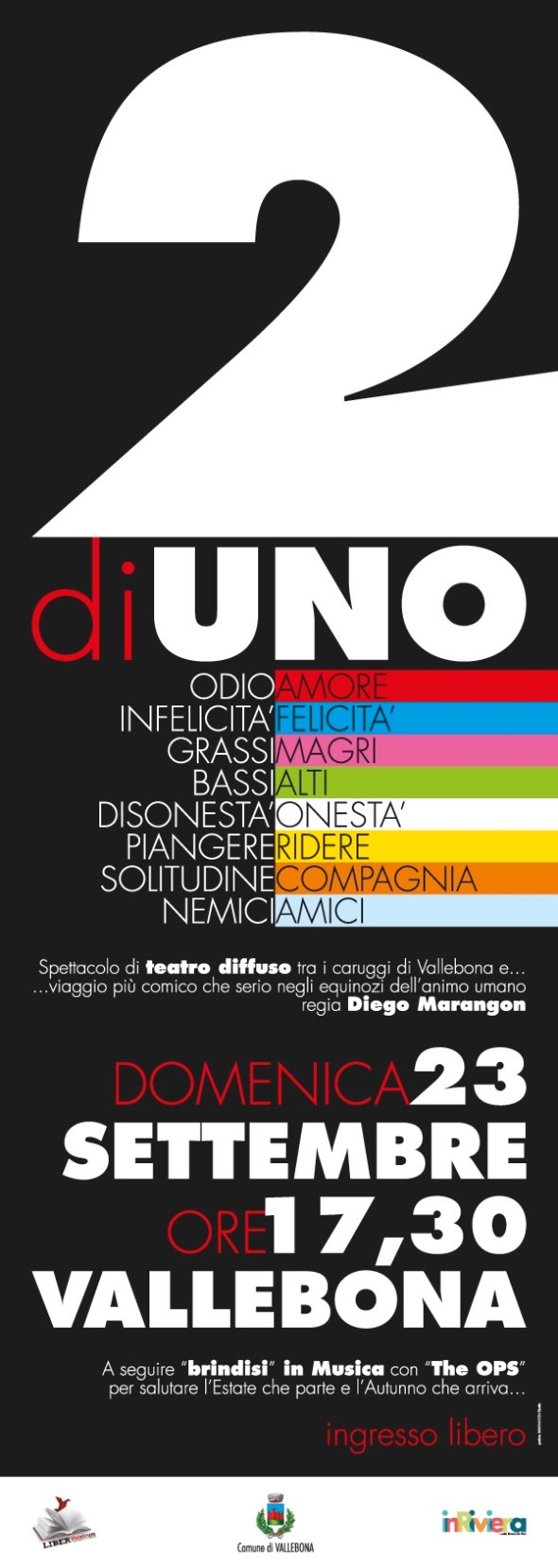 Appuntamento fissato per Domenica 23 settembre alle 17.30, con il patrocinio e il contributo del Comune di Vallebona, a celebrare l’Equinozio d’Autunno e a ingresso gratuito, quando con la regia di Diego Marangon, andrà in scena ‘Due di uno’ spettacolo di teatro diffuso tra i carrugi del borgo e viaggio più comico che serio negli equinozi dell’animo umano. A seguire “brindisi” in Musica con “The OPS” per salutare l’Estate che parte e l’Autunno che arriva…