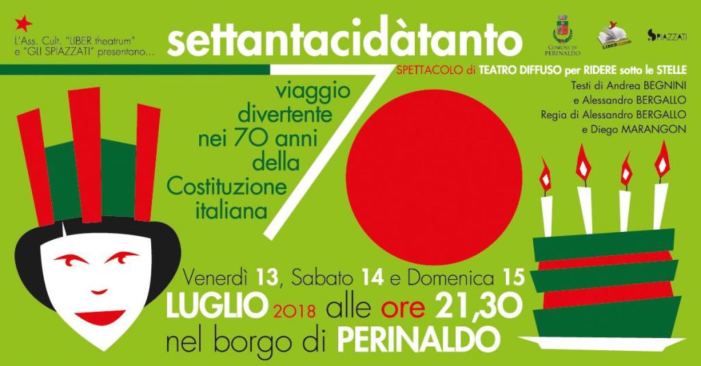 Nonostante il tema certamente serio e impegnativo (la celebrazione dei settant’anni dalla promulgazione della Costituzione italiana) “SETTANTACIDATANTO” lo spettacolo di teatro diffuso che nell’estate 2018 si propaga nei caruggi di Perinaldo, è stato uno dei più divertenti e godibili messi in scena da LIBER theatrum.Grazie ai testi di Andrea Begnini, la regia di Alessandro Bergallo e Diego Marangon e la sinergia con il gruppo genovese de Gli Spiazzati, il pubblico ha infatti potuto godere di uno spettacolo sorprendente, ironico e al tempo stesso dalle tematiche su cui riflettere.