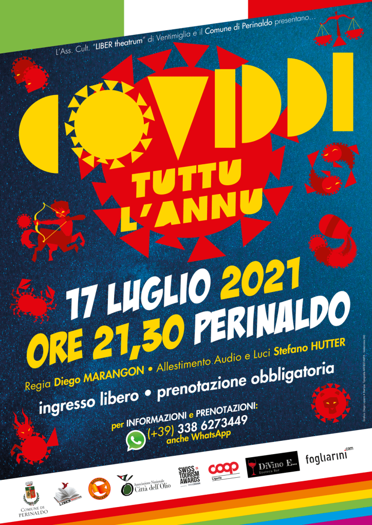 Dopo un anno di sosta finalmente LIBER theatrum torna in scena e lo fa con “COVIDDI TUTTU L’ANNU” nuovissimo spettacolo previsto a Perinaldo domani SABATO 17 Luglio alle ore 21.30 in Piazza San Nicolò e in replica Sabato 4 Settembre ai Giardini Botanici Hanbury di Ventimiglia.
