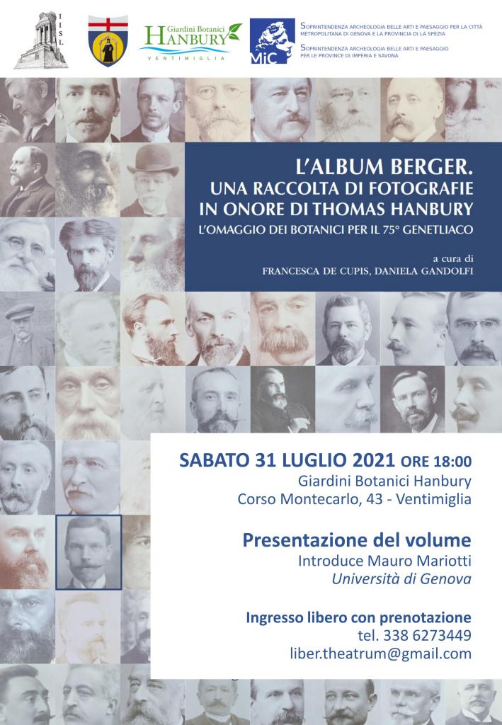 In calendario un prestigioso incontro d’autore: la presentazione del volume “L’Album Berger. Una raccolta di fotografie in onore di Thomas Hanbury” (l’omaggio dei botanici per il 75° genetliaco) a cura della Dott.ssa Francesca De Cupis e della Dott.ssa Daniela Gandolfi. A moderare l’evento il Professor Mauro Mariotti, dell’Università degli Studi di Genova e Direttore dei Giardini Hanbury.