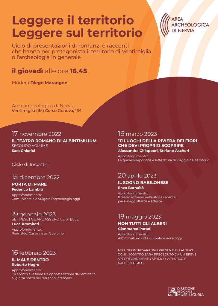 Inaugura il 17 novembre la prossima iniziativa culturale LEGGERE IL TERRITORIO – LEGGERE SUL TERRITORIO a cura dell’Area Archeologica di Nervia di Ventimiglia. Sette incontri che si terranno dal 17 Novembre 2022 al 18 maggio 2023, con cadenza mensile: la rassegna sarà ospitata nei locali dell’Antiquarium in Corso Genova 134, proprio di fronte al Teatro Romano. Il corso è accreditato sulla piattaforma SOFIA del Miur, è previsto il rilascio di crediti formativi per gli insegnanti.