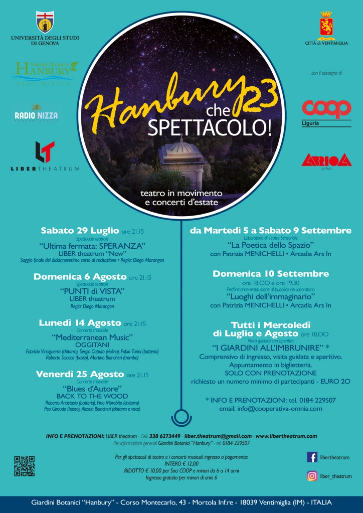 Torna anche in questa calda estate 2023, ospitata nella splendida ambientazione dei Giardini Botanici Hanbury a Ventimiglia in frazione La Mortola Inferiore, organizzata e curata da LIBER THEATRUM, associazione culturale ventimigliese molto attiva sul territorio, la manifestazione artistica “HanburycheSPETTACOLO!”23 – teatro in movimento e concerti d’estate,