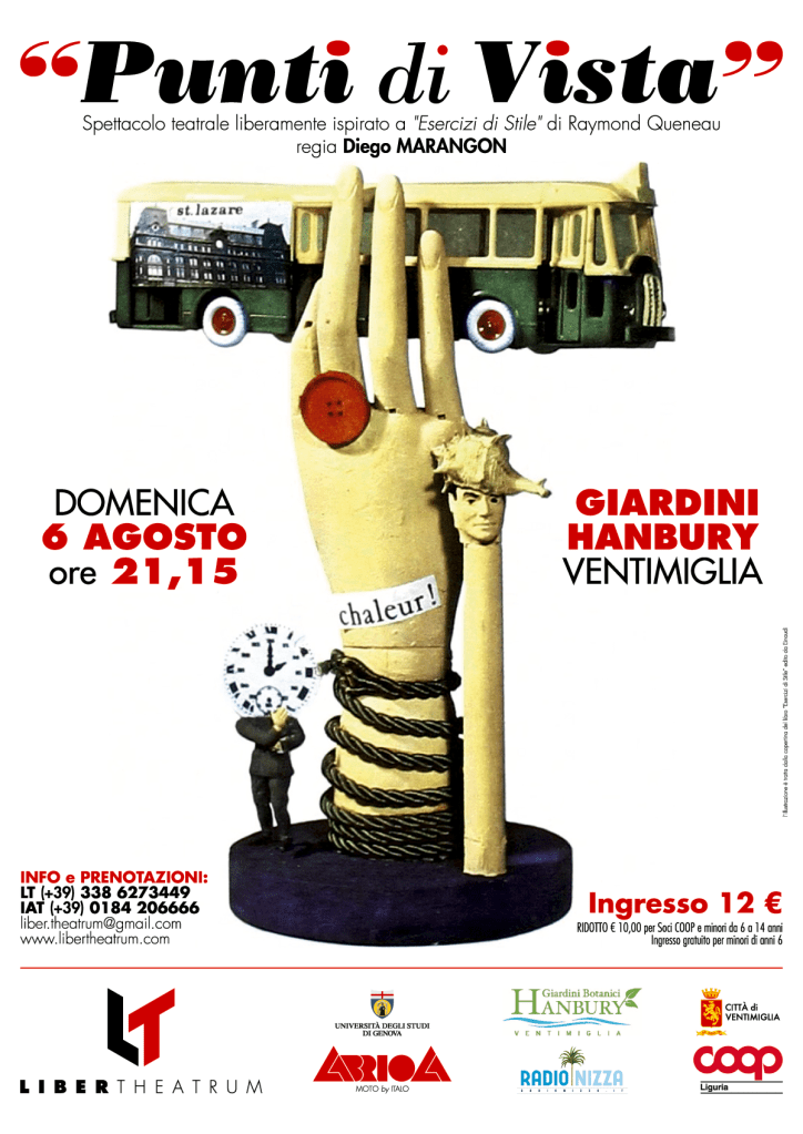 A più di dieci anni dalla sua prima messa in scena itinerante, LIBER THEATRUM ripropone quindi, in maniera stanziale, sul palco allestito davanti alla Villa, un lavoro teatrale curioso e particolare, liberamente ispirato all’originalissimo e geniale testo francese “Esercizi di stile” di Raymond Queneau, splendidamente tradotto in Italia per Einaudi da Umberto Eco.