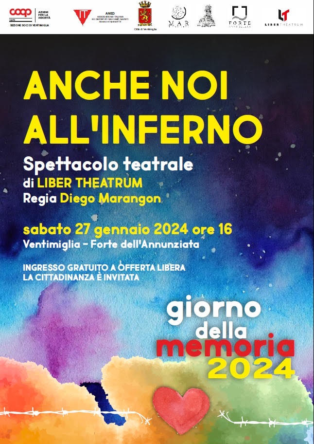 Anno nuovo e subito LIBER THEATRUM torna in scena – Sabato 27 Gennaio alle ore 16.00 – con ingresso gratuito a offerta libera, nelle belle sale sotterranee del Museo Civico Archeologico al Forte dell’Annunziata, con lo spettacolo “ANCHE NOI ALL’INFERNO” regia Diego Marangon, in occasione della Giornata della Memoria, inserito negli eventi realizzati in collaborazione con COOP Liguria, con il patrocinio della Città di Ventimiglia e per la prima volta anche di ANED: Associazione Italiana ex Deportati nei Campi Nazisti di savona e Imperia.