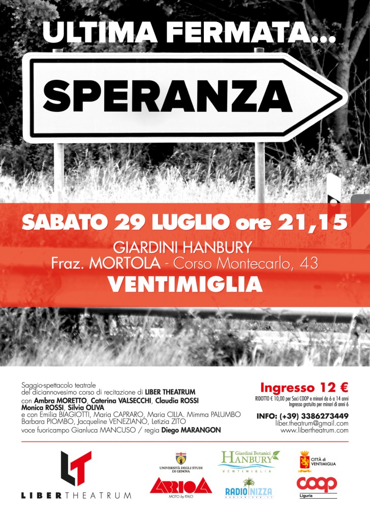 Venerdì 1° Agosto quindi ancora un appuntamento speciale che racchiude al meglio lo spirito di “HanburycheSpettacolo!”25 – teatro in movimento e concerti d’estate, giunto quest’anno alla sua XI^ edizione, ospitato come sempre nella suggestiva ambientazione dei Giardini Botanici Hanbury di Ventimgilia in Fraz. Mortola Inf.re in C.so Montecarlo 43 – quasi al confine con la vicina Francia. Ultimo appuntamento estivo del Festival sarà quello previsto per Domenica 10 Agosto sempre alle ore 21.15, la notte di San Lorenzo – “la notte delle stelle cadenti” – quando LIBER THEATRUM porterà in scena lo spettacolo teatrale “LE STELLE CI GUARDANO”. Curato e organizzato dall’Associazione culturale Liber Theatrum con la direzione artistica di Diego Marangon il Festival viene riproposto grazie alla consueta ospitalità offerta dall’Università degli Studi di Genova e al naturale supporto logistico dei Giardini Hanbury e della Cooperativa Omnia, godendo anche quest’anno del patrocinio e del contributo del Comune di Ventimiglia, oltre al consueto e costante sostegno di Coop Liguria e Labriola moto Honda. Info e prenotazioni (anche su Whatsapp) Liber Theatrum: 338 6273449 – 0184 229507 – liber.theatrum@gmail.com – www.libertheatrum.com