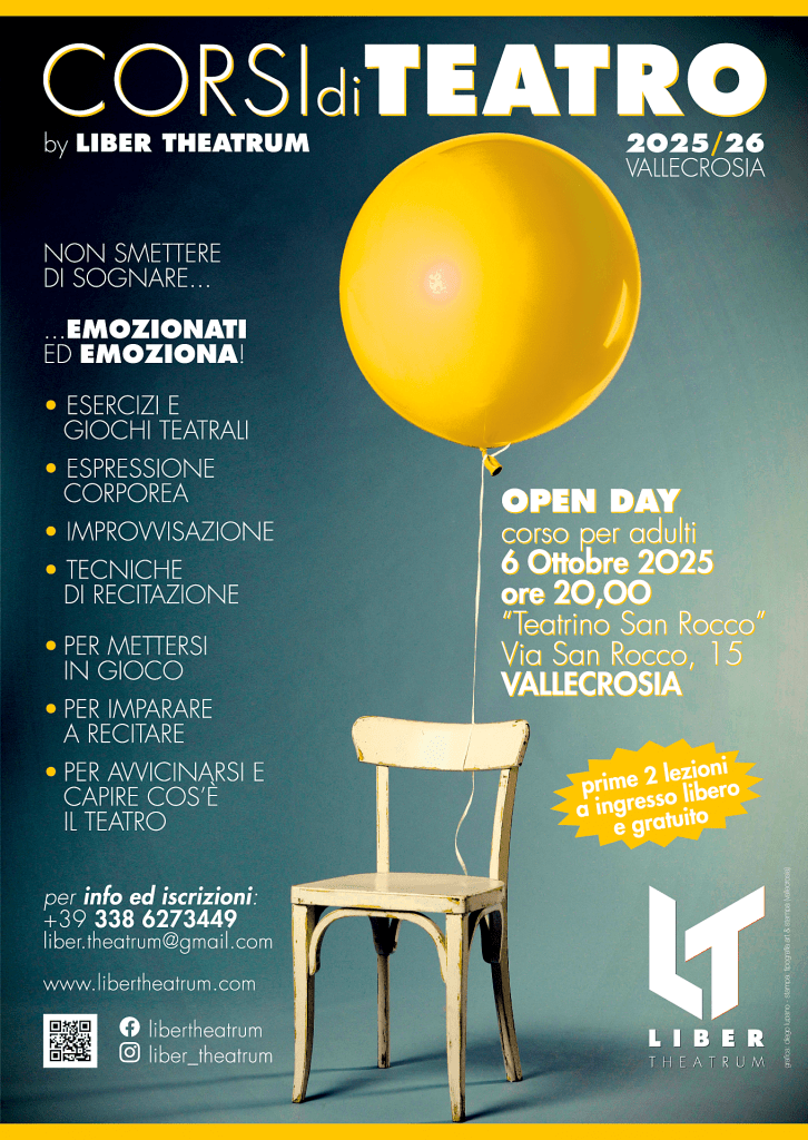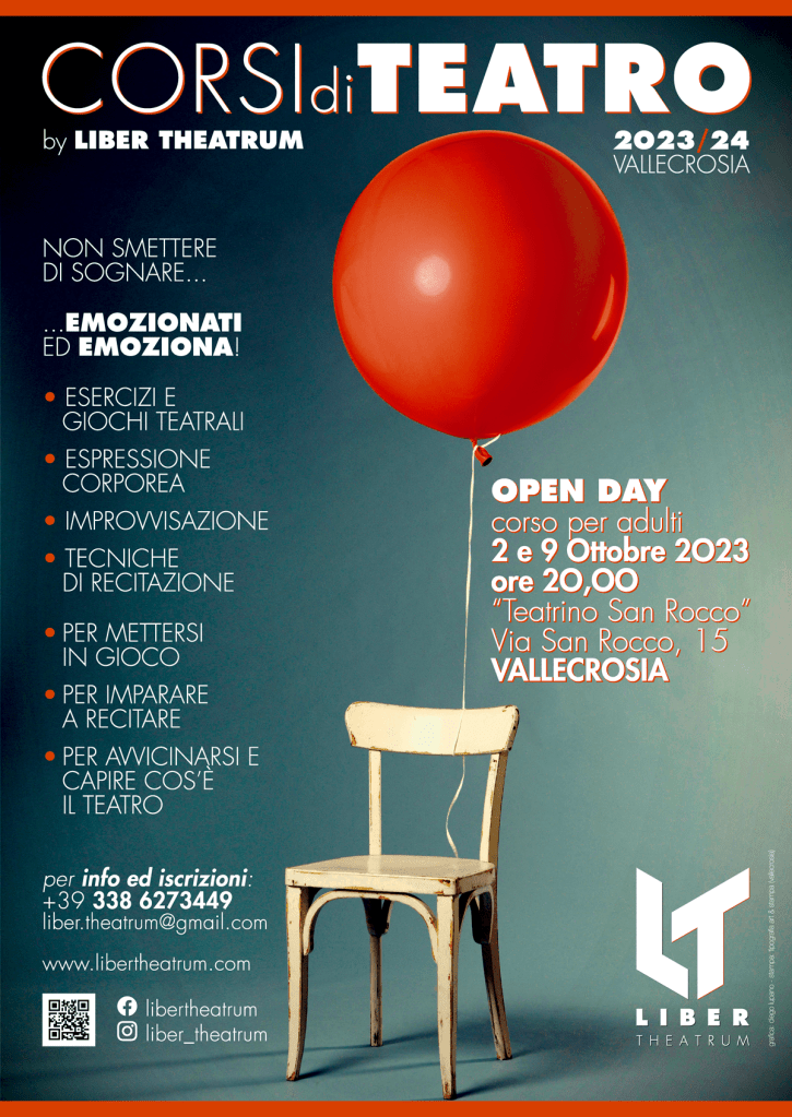 Con un “OPEN DAY” dedicato al CORSO PER ADULTI fissato per Mercoledì 19 Ottobre alle ore 20.00 a Vallecrosia presso il “piccolo teatrino” sito in Via San Rocco 16 a Vallecrosia (sotto la chiesa moderna di San Rocco) attesissimi e sempre molto richiesti, iniziano anche quest’anno i nuovi corsi di recitazione organizzati dall’Associazione Culturale “LIBER theatrum”.