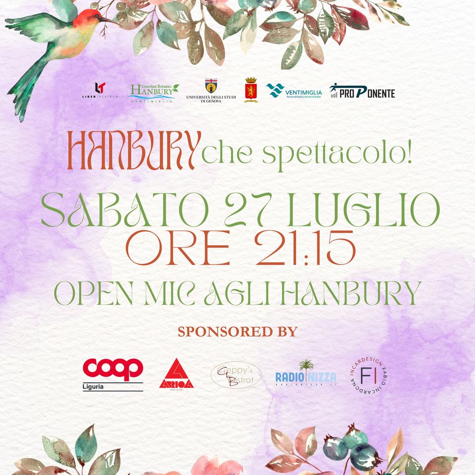 Curato e organizzato dall’Associazione culturale Liber Theatrum con la direzione artistica di Diego Marangon “HanburycheSpettacolo!”25 viene riproposto grazie alla consueta ospitalità offerta dall’Università degli Studi di Genova e al naturale supporto logistico dei Giardini Hanbury e della Cooperativa Omnia, godendo anche quest’anno del patrocinio e del contributo del Comune di Ventimiglia, oltre al consueto e costante sostegno di Coop Liguria e di Labriola moto Honda.