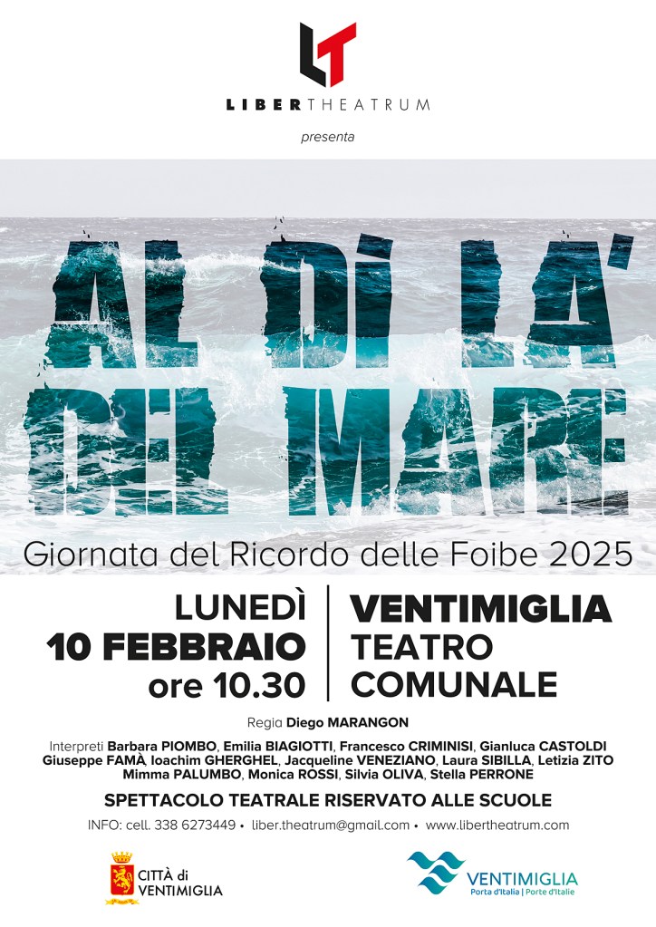 Anche in occasione delle celebrazioni del “Giorno del Ricordo” – dedicato alle vittime delle “foibe e dell’esodo istriano giuliano-dalmata” – Liber Theatrum protagonista di uno spettacolo teatrale, in programma nella mattinata di Lunedì 10 Febbraio al teatro Comunale di Ventimiglia con il sostegno e il patrocinio della città di confine. Riservato alle scuole medie, sarà però anche consentito l’ingresso libero e gratuito alla galleria per la Cittadinanza preferibilmente prenotando al 338 6273449.