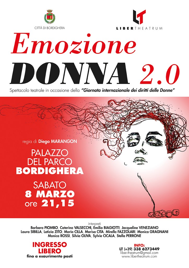 Con il patrocinio e il contributo della Città di Bordighera, Sabato 8 marzo alle ore 21.15 al Teatro del Palazzo del Parco, a ingresso gratuito sino a esaurimento posti – in occasione della Giornata Internazionale dei diritti delle Donne – è in programma lo spettacolo teatrale di Liber Theatrum dal titolo “Emozione Donna 2.0” per la regia di Diego Marangon.
