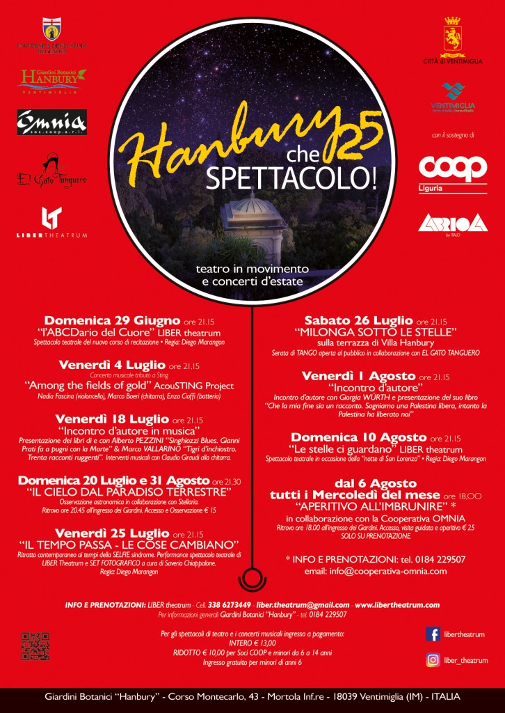 Curato e organizzato dall’Associazione culturale Liber Theatrum con la direzione artistica di Diego Marangon e ospitato, come sempre, nella splendida cornice naturale dei Giardini Botanici Hanbury di Ventimiglia in frazione La Mortola Inferiore, Corso Montecarlo 43 (praticamente al confine con la vicinissima Francia) “HanburycheSpettacolo!”25 viene riproposta per la sua XI^ edizione grazie alla consueta ospitalità offerta dall’Università degli Studi di Genova e al naturale supporto logistico dei Giardini Hanbury e della Cooperativa Omnia e alla manifestazione anche quest’anno è stato garantito il patrocinio e il contributo del Comune di Ventimiglia oltre al consueto e costante sostegno di Coop Liguria. Info e prenotazioni Liber Theatrum: 338 6273449 – liber.theatrum@gmail.com – www.libertheatrum.com – 0184 229507