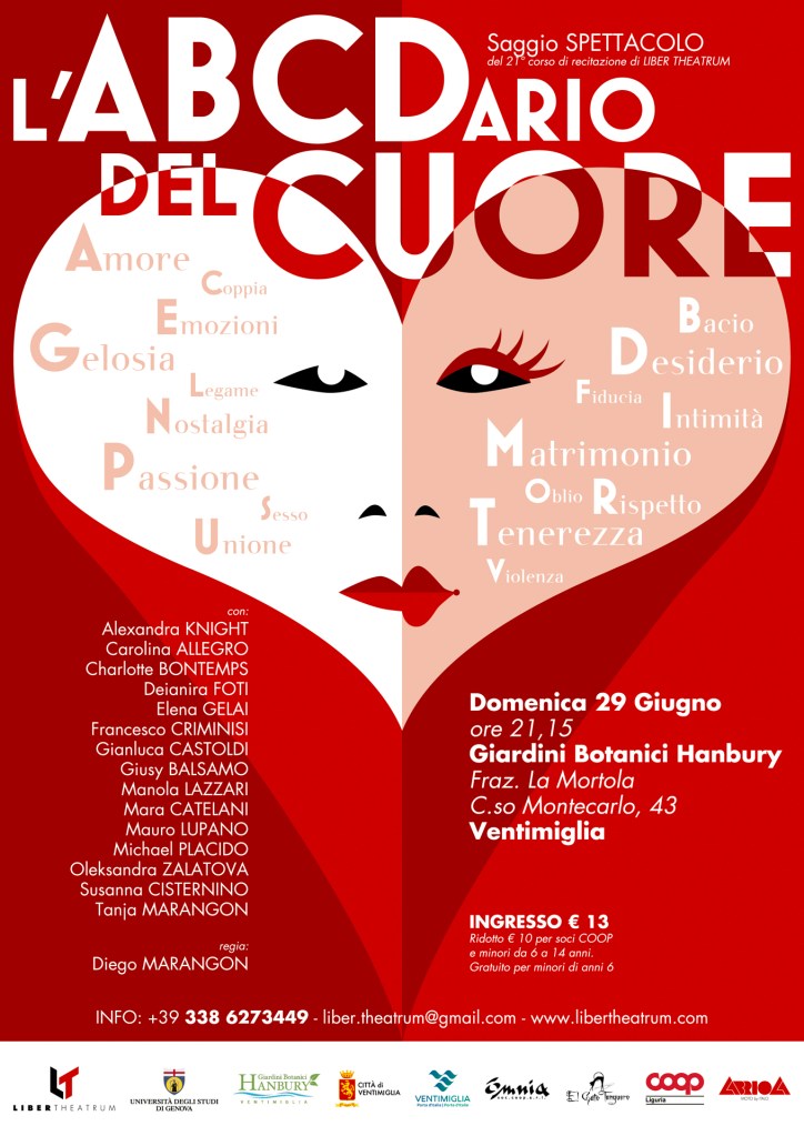 Con lo spettacolo teatrale “l’ABCDario del Cuore” – in scena gli allievi del nuovo corso di recitazione di LIBER THEATRUM – si apre DOMENICA 29 Giugno alle ore 21.15 nell’incantevole ambientazione dei Giardini Botanici Hanbury a Ventimiglia in fr. La Mortola Inf.re Corso Montecarlo 43 (praticamente al confine con la Francia) l’XI^ edizione del Festival di arti varie “HanburycheSpettacolo!”25 – teatro in movimento e concerti d’estate, curato e organizzato dall’Associazione Culturale Liber Theatrum con la direzione artistica di Diego Marangon.