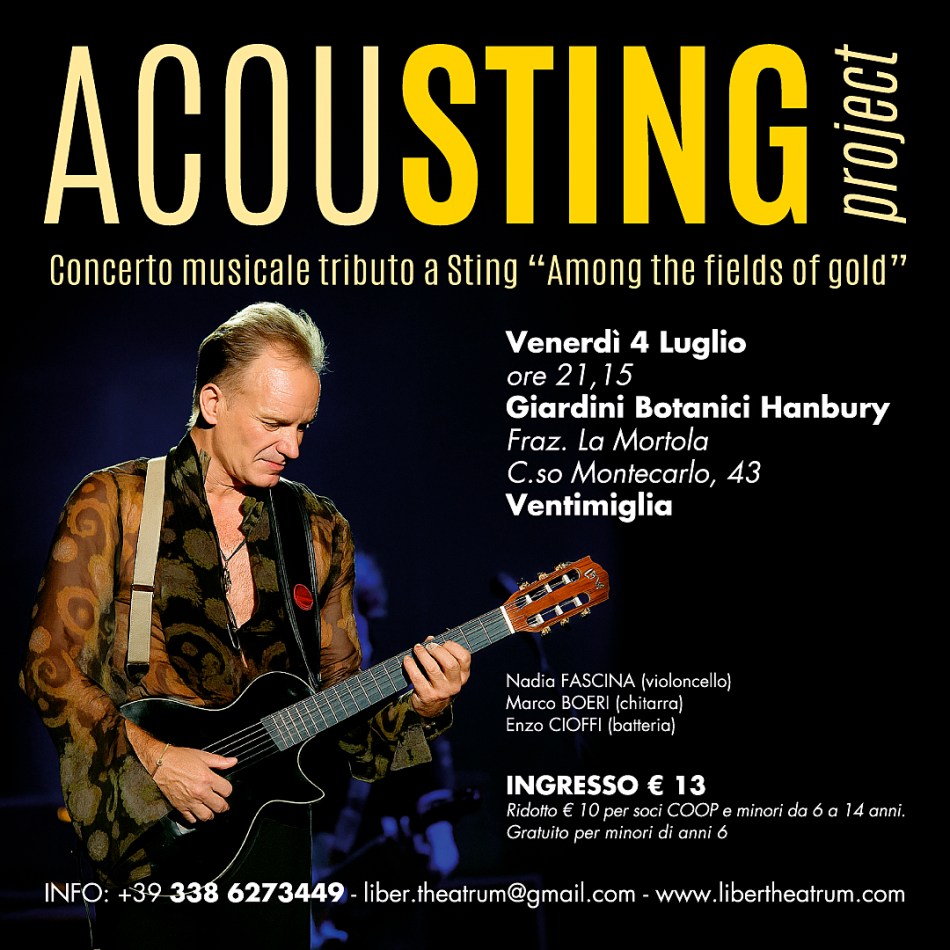 Dopo il felice, e dal numeroso pubblico presente apprezzatissimo esordio Domenica scorsa – con lo spettacolo teatrale degli allievi dell’ultimo corso di recitazione di Liber Theatrum “L’abcdario del Cuore” – l’XI^ edizione del Festival di arti varie “HanburycheSpettacolo!”25 – teatro in movimento e concerti d’estate, prosegue Venerdì 4 Luglio alle ore 21.15 con l’AcouSting Project di Nadia Fascina al violoncello e Marco Boeri alla chitarra, accompagnati eccezionalmente da Enzo Cioffi alla batteria, con il loro concerto “Among the fields of gold”. Una originale serata musicale dedicata interamente al vasto repertorio del bassista e songwriter inglese Gordon Matthew Sumner, il noto Sting. Già membro della mitica rock band dei Police dal 1976 al 1985, esperienza che poi abbandonò per intraprendere una carriera solista che gli permettesse di esprimere le molte sfaccettature della propria raffinata vena musicale, Sting ha utilizzato nelle sue composizioni sonorità e stili che hanno spaziato dalla musica classica al jazz, dal folk inglese al country americano, dal rock al blues, dal funk al R&B, mantenendo una continuità stilistica molto personale ed elegante e ciononostante di grande fruibilità. Nella splendida e unica ambientazione dei Giardini Botanici Hanbury di Ventimiglia, si preannuncia quindi una serata eccezionale accompagnata da brani che hanno fatto la storia della musica internazionale e sapranno ancor più emozionare perché proposti in una formula e con arrangiamenti unici e inediti.
