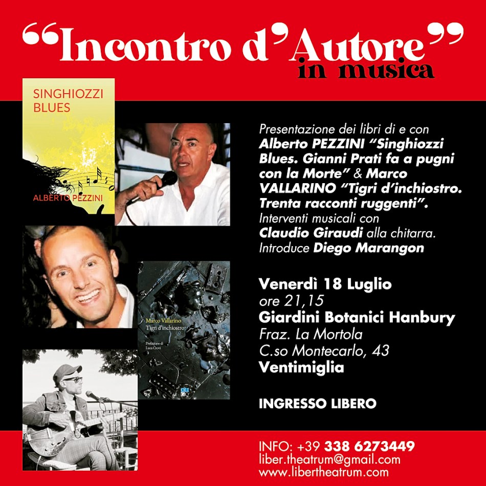 – Venerdì 18 luglio alle ore 21.15 primo appuntamento letterario in musica a ingresso gratuito, ospiti gli autori Alberto Pezzini con il suo ultimo romanzo “Singhiozzo blues. Gianni Prati fa a pugni con la morte” e Marco Vallarino con il suo “Tigri d’inchiostro. Trenta racconti ruggenti”. Nel corso della presentazione intermezzi musicali con Claudio Giraudi alla chitarra.