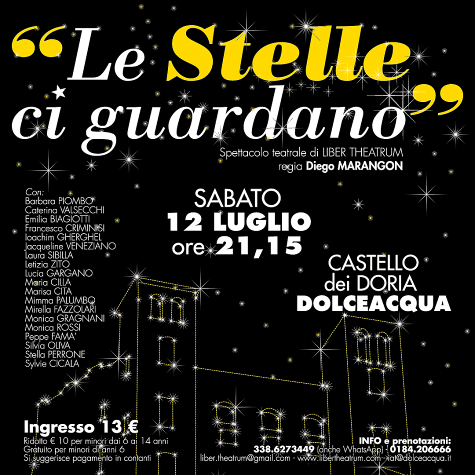 E’ in programma Sabato 12 Luglio alle ore 21.15 – a cielo aperto – nella suggestiva ambientazione del Castello Doria di Dolceacqua, in un’atmosfera assolutamente adatta e confacente, la messa in scena dello spettacolo teatrale di Liber Theatrum “Le stelle ci guardano” per la regia di Diego Marangon.