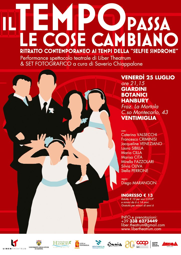 Prima serata fissata per Venerdì 25 Luglio ore 21.15 sul palco nel piazzale davanti alla Villa, con un progetto assai originale, frutto della sinergia e collaborazione tra Liber Theatrum e il noto fotografo ventimigliese Saverio Chiappalone. “Il tempo passa – Le cose cambiano. Ritratto contemporaneo ai tempi della Selfie sindrome” per la regia di Diego Marangon, il titolo scelto per la performance teatrale di Liber Theatrum seguita da un ‘Set fotografico che offrirà la possibilità agli spettatori presenti di “mettersi in posa” e farsi immortalare, in una delle bellissime sale all’interno della Villa dall’occhio esperto, creativo e molto professionale di Saverio Chiappalone.