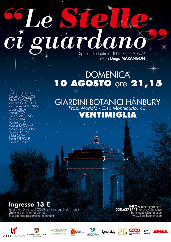Sarà lo spettacolo teatrale di Liber Theatrum “Le stelle ci guardano” – Domenica 10 Agosto alle ore 21.15 – in concomitanza con la notte di San Lorenzo “la notte delle stelle cadenti” a chiudere il Festival di arti varie “HnburycheSpettacolo!”25 – teatro in movimento e concerti d’estate, curato e organizzato dall’Associazione Culturale Liber Theatrum con la direzione artistica di Diego Marangon, che anche quest’anno ha riscosso un ottimo riscontro e gradimento da parte del pubblico. Ospitato nella suggestiva e particolarmente adatta ambientazione dei Giardini Botanici Hanbury di Ventimiglia in fraz. Mortola Inf.re, praticamente al confine con la Francia, il pubblico potrà assistere a un lavoro corale in cui i numerosi interpreti coinvolti regaleranno le tante emozioni che guardare un cielo stellato, soprattutto nel periodo estivo, sa fare nascere in ognuno di noi. Volgendo lo sguardo al tetto di stelle, che da sempre veglia sulle nostre esistenze, l’occasione permetterà di parlare con gli innumerevoli puntini luminosi confidando i propri desideri, interrogarli, sperare in risposte tanto attese, rivivere momenti emozionanti o semplicemente ricordare un viso, un sorriso, una voce. E poi sorridere, ma anche arrabbiarsi… Uno spettacolo malinconico ma anche divertente, pensando all’infinito di un cielo stellato in una notte buia e alla meraviglia che si prova alzando occhi e naso all’insù, senza dimenticare che anche “Le stelle ci guardano”!