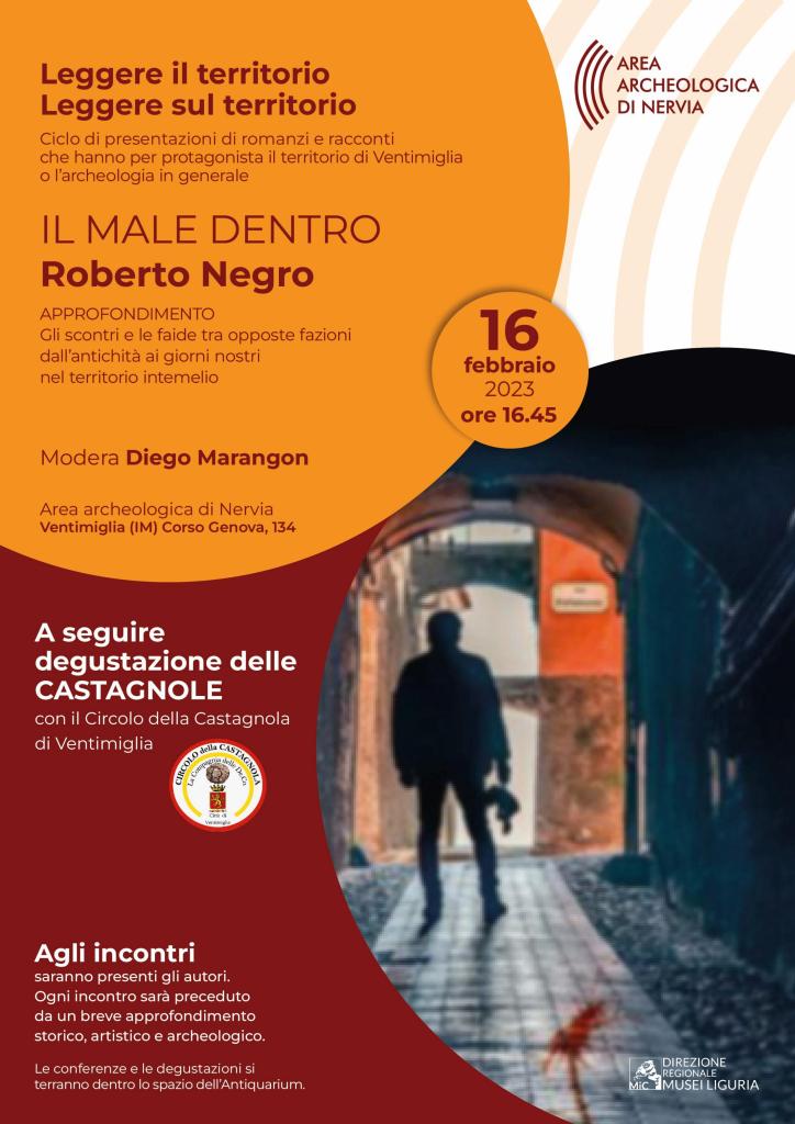 A dialogare con l’autore sarà Diego Marangon, attore e regista teatrale che da anni si occupa di cultura sul territorio con l’Associazione Culturale LIBER THEATRUM, preceduto da un breve intervento di approfondimento archeologico e storico artistico ispirato dal libro, a cura di Sara Chierici (archeologa del Polo Museale e dell’Area Archeologica di Nervia) dal titolo “Gli scontri e le faide tra opposte fazioni dall’antichità ai giorni nostri nel territorio intemelio”.